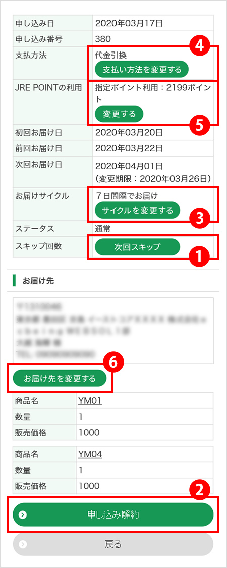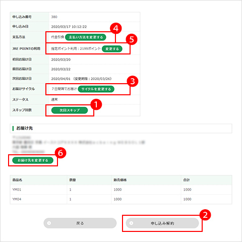 マイページ内の「定期便・頒布会情報」から下記の変更が可能です