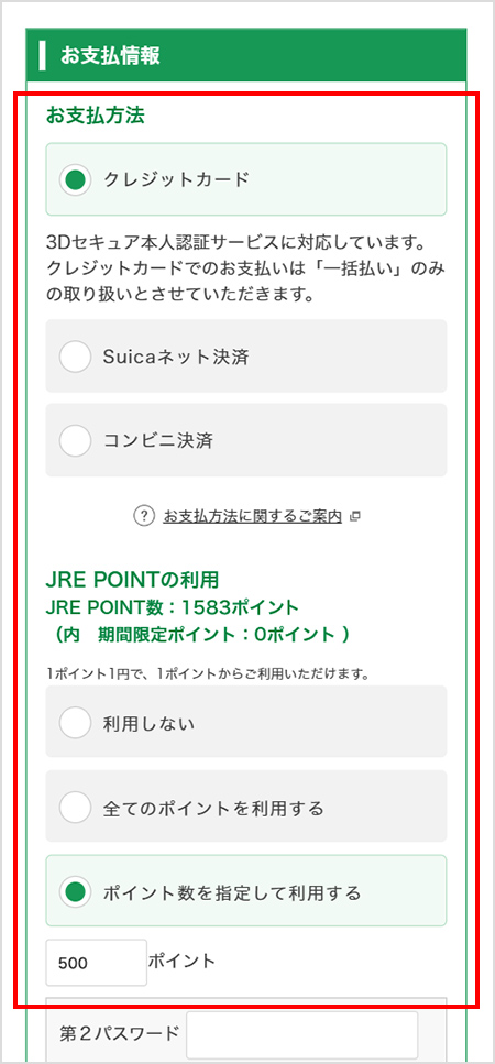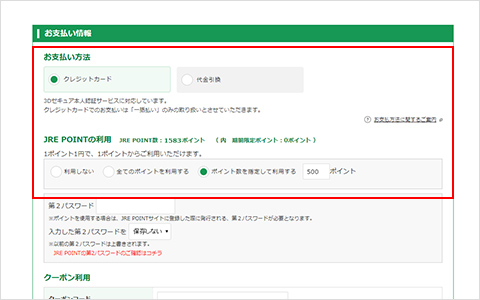 クレジットカード、JRE POINT、代金引換が利用できます。